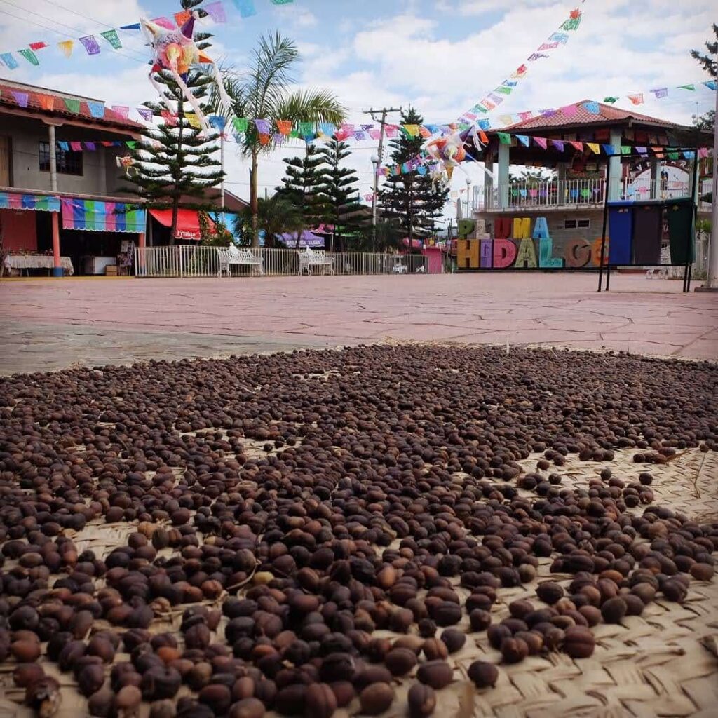 ייבוש פולי קפה בכיכר המרכזית של הכפר