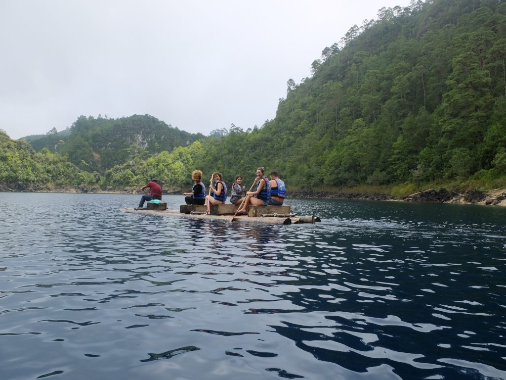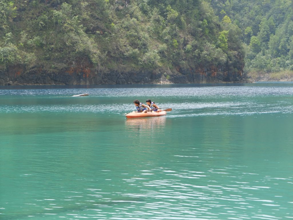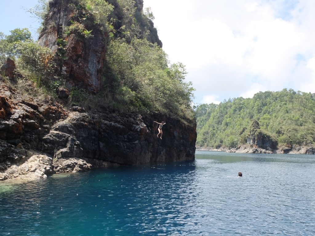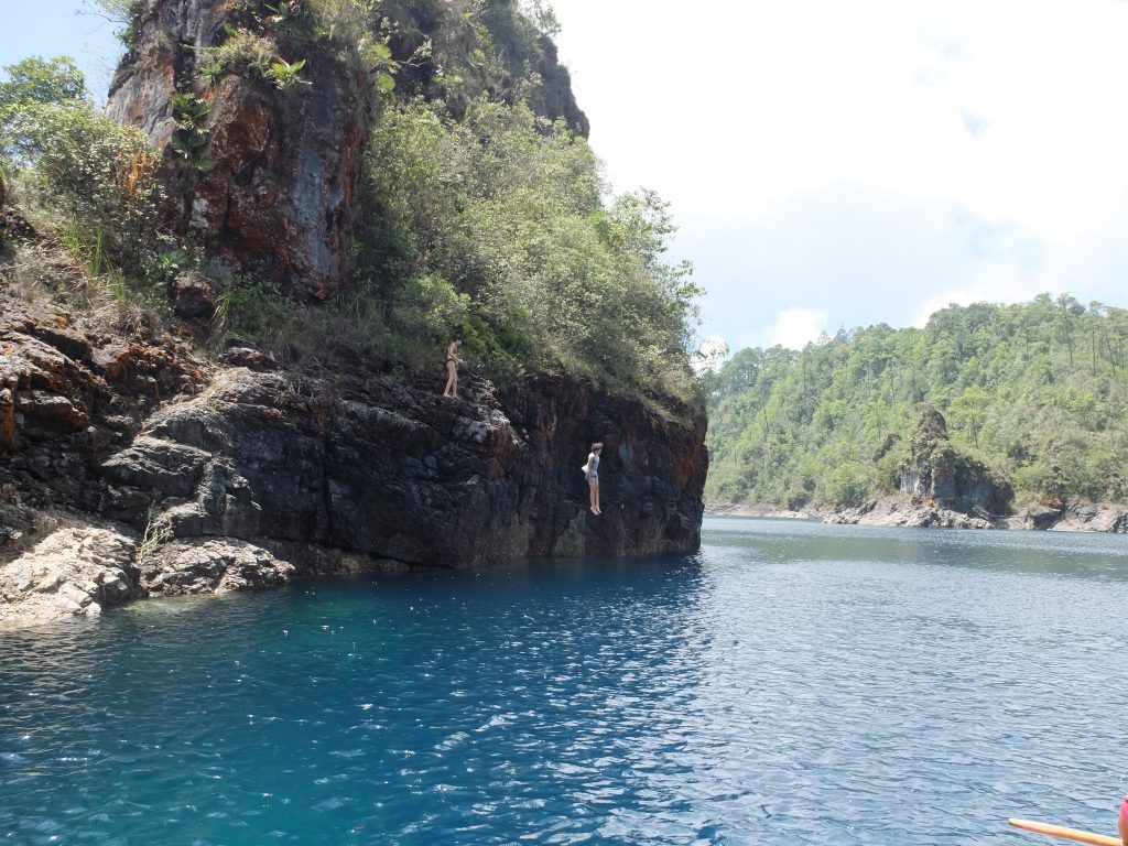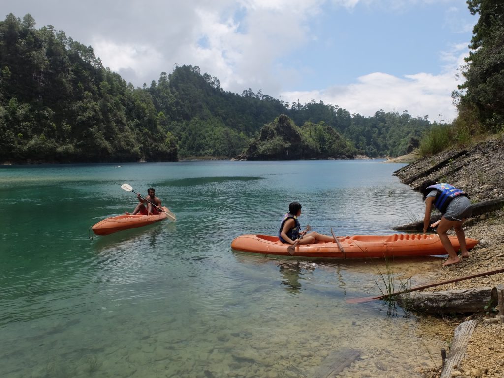 באגם האחרון בו ביקרנו חיכו לנו רפסודה ושלושה קייאקים, עלינו עליהם לשייט עצמאי והגענו לאזור שבו המים היו כחולים וצלולים, כמובן שעגנו את כלי השייט וקפצנו למים, נדב זיהה על אי באמצע האגם, שנראה כמו פרופיל של שימפנזה, מקום מעולה לקפיצה מגובה כ- 4 מ' למים – בקטנה, אבל לא ויתרנו על החוויה.